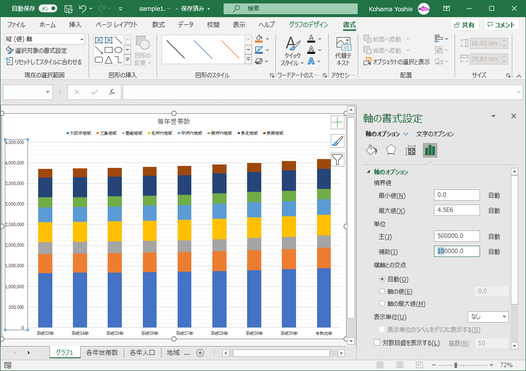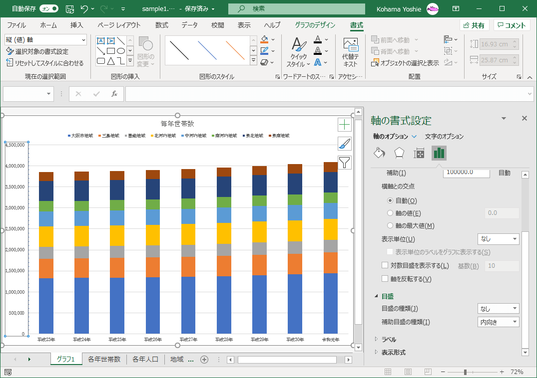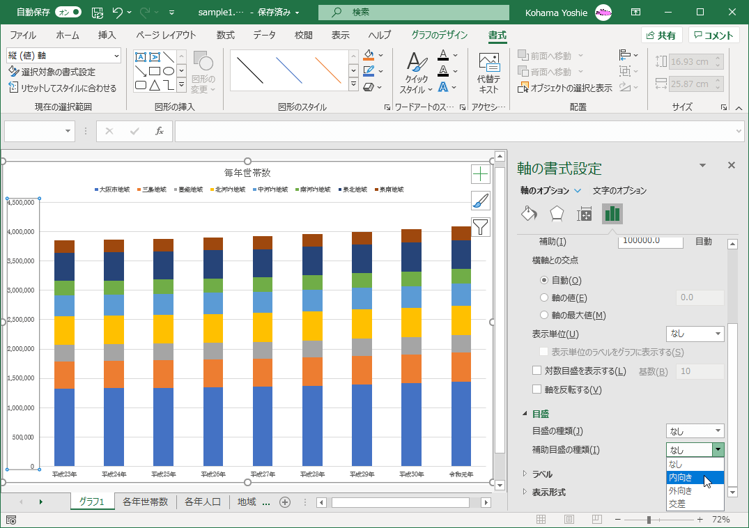 グラフの主・補助軸の目盛の間隔や種類を設定するには