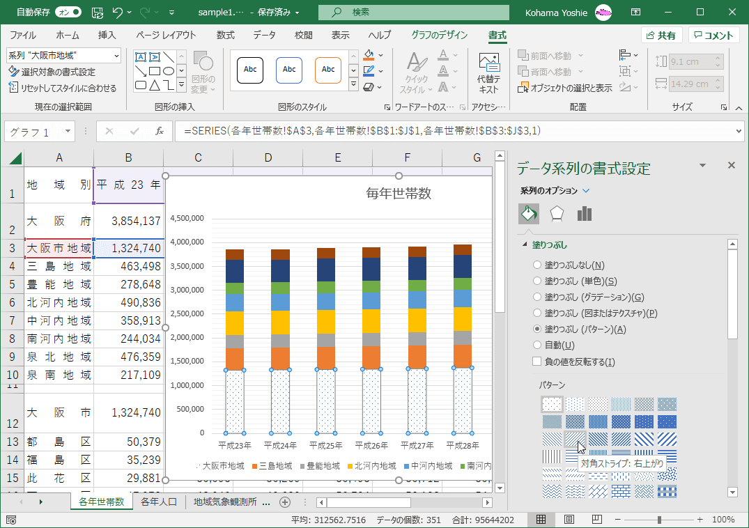 - 塗りつぶし方法をパターンにする場合は[系列の塗りつぶしの色]をパターンにして、一覧から任意のパターンを選択します。