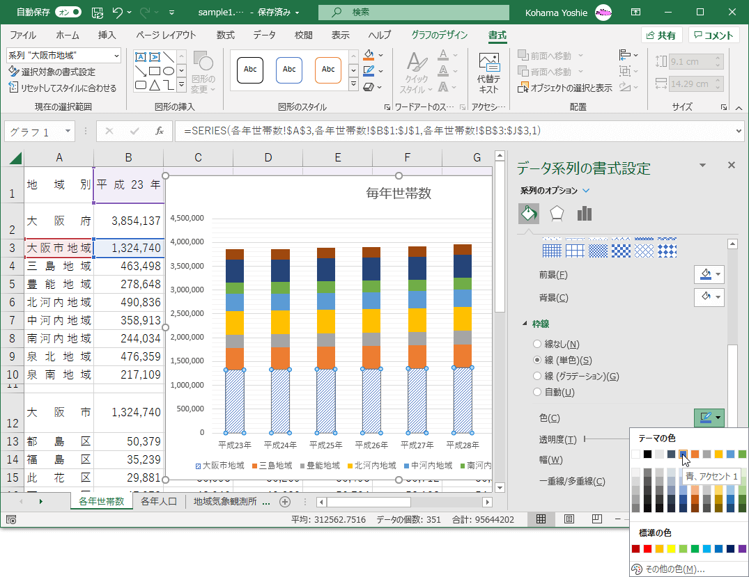 - 系列の枠線の色を指定する場合は、[枠線]より色などを選択します。