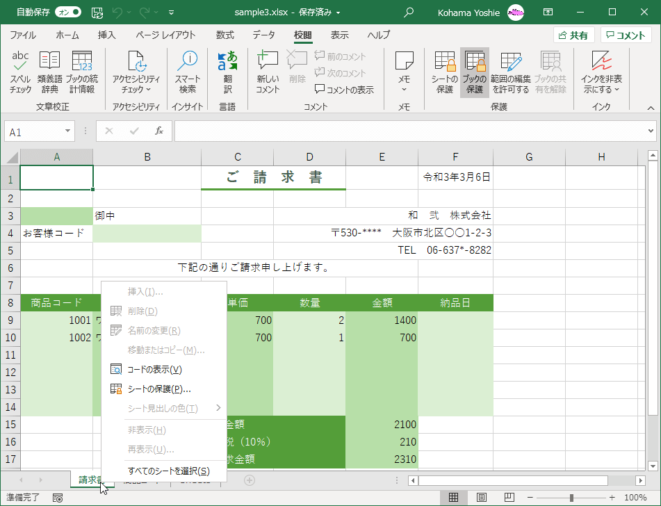 シート構成の保護を解除するには、[校閲]タブの[保護]グループの[シートの保護]をもう一度クリックします。
