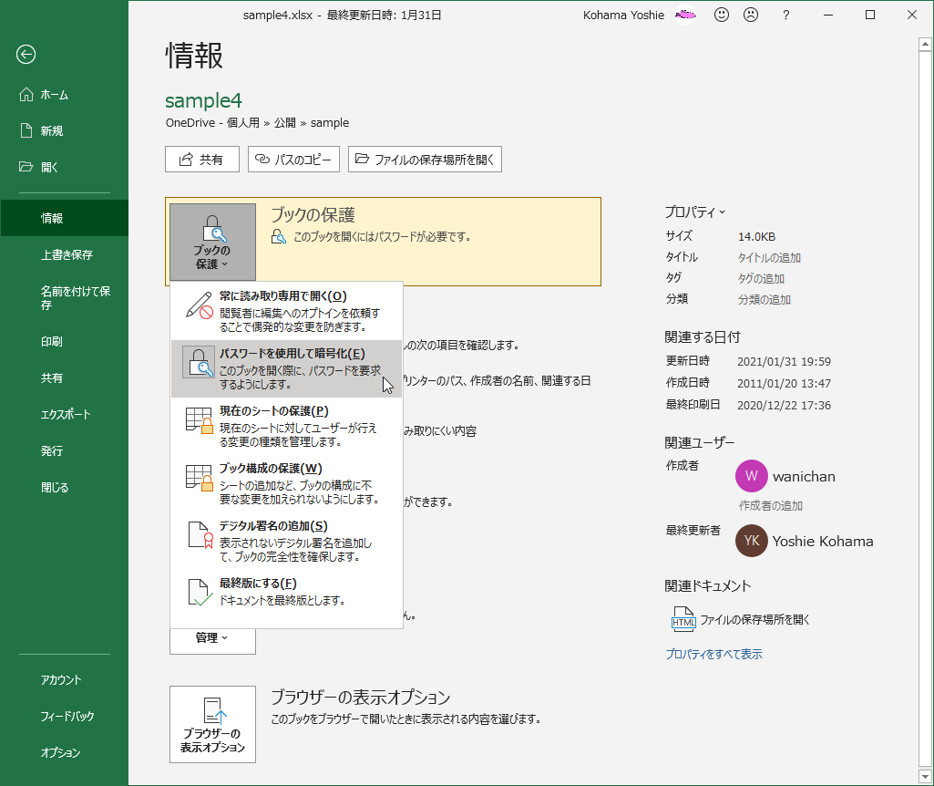 ブックを開く際にパスワードを要求するようにするには、[ファイル]タブを開き、[情報]タブの[ブックの保護]をクリックして[パスワードを使用して暗号化]を選択し、パスワードを指定します。パスワードを変更するには、[ファイル]タブを開き、[情報]タブの[ブックの保護]をクリックして[パスワードを使用して暗号化]を選択し、新しいパスワードを入力します。パスワードを解除するには、入っているパスワードを削除するとOKです。