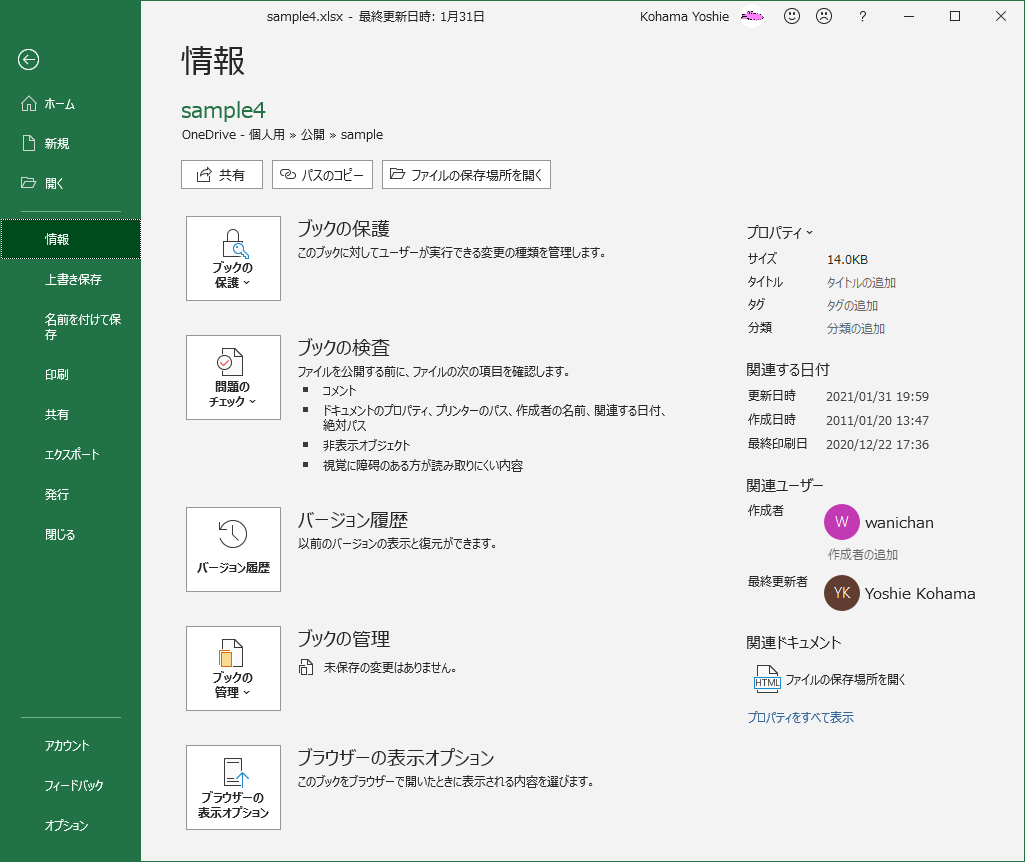 - [ファイル]タブを開き、[情報]タブの[ブックの保護]をクリックします。