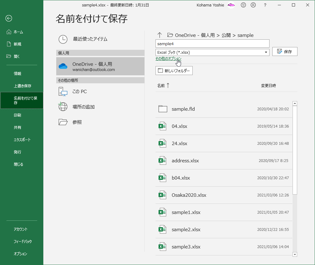 - [ファイル]タブを開き、[名前を付けて保存]をクリックします。