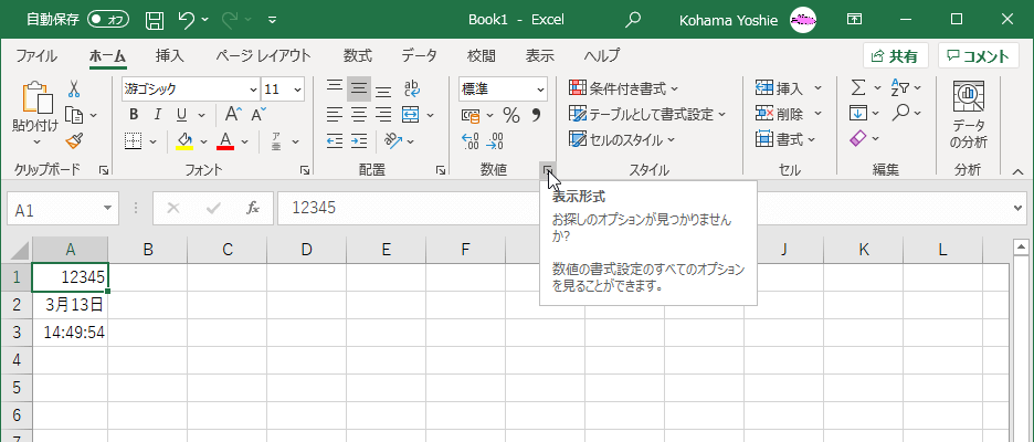 漢数字で数値を表示したいセルを選択し、[ホーム]タブの[数値]グループ右下のダイアログボックス起動ツールをクリックします。
