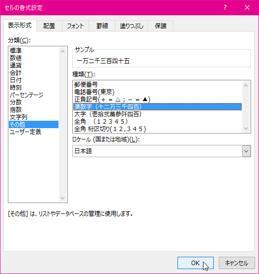 [ロケール(国または地域)]が[日本語]になっていることを確認し、一覧から漢数字を選択して[OK]ボタンをクリックします。