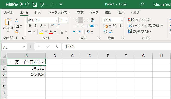 漢数字で数値を表示したいセルを選択し、[ホーム]タブの[数値]グループ右下のダイアログボックス起動ツールをクリックして、[セルの書式設定]ダイアログボックスの[表示形式]タブで[その他]を選択し[ロケール(国または地域)]が[日本語]になっていることを確認して、一覧から漢数字を選択します。