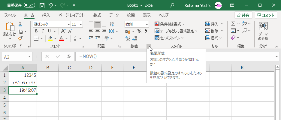 時刻が入ったセルを選択し、[ホーム]タブの[数値]グループ右下のダイアログボックス起動ツールをクリックします。
