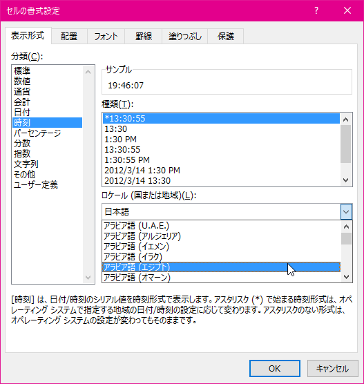時刻セルを選択し、[ホーム]タブの[数値]グループ右下のダイアログボックス起動ツールをクリックして、[セルの書式設定]ダイアログボックスの[表示形式]タブで[時刻]を選択し、[ロケール(国または地域)]一覧から対象となる国または地域を選択して、一覧から表示形式を選択します。