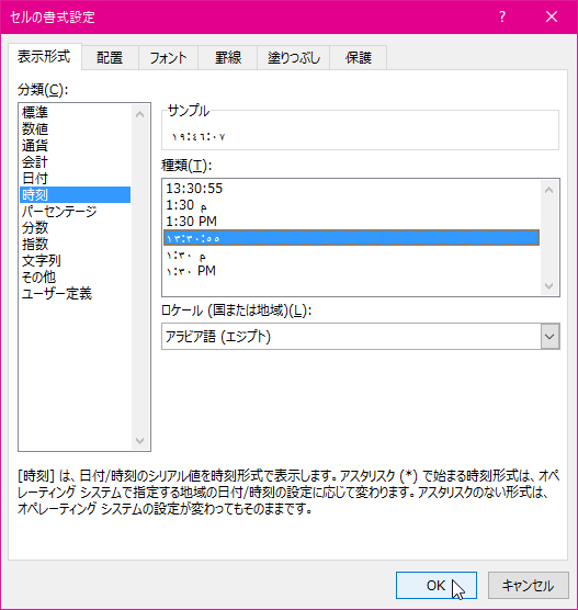 - [セルの書式設定]ダイアログボックスの[表示形式]タブで、[時刻]を選択します。