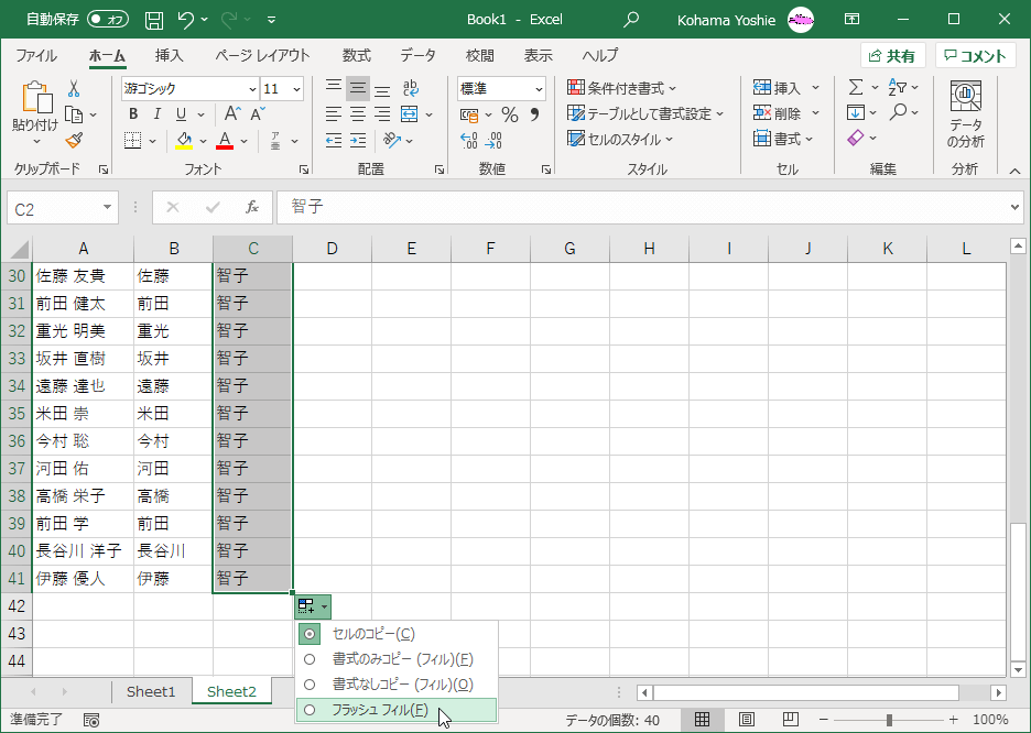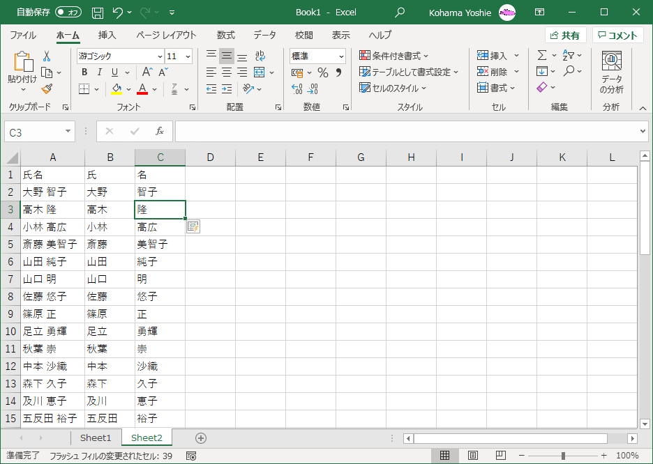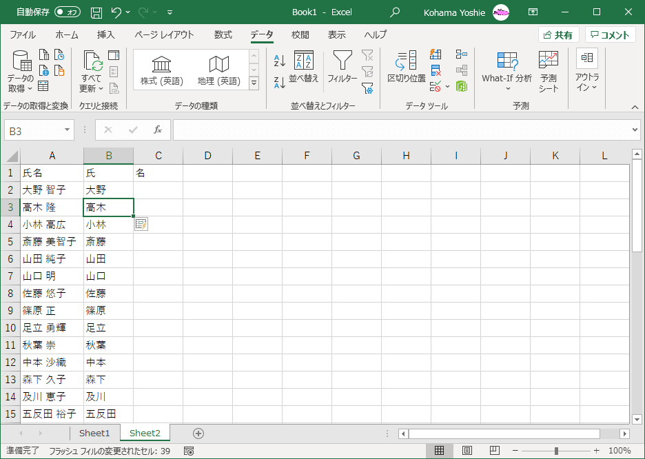 値を自動的に埋め込む「フラッシュフィル」機能を使用することで、名前の姓と名のデータをそれぞれ別々のセルに分割することができます。あらかじめ1行目にパターンとなるセルを入力してから[データ]タブを開き、[データツール]グループの[フラッシュフィル]を使用します。ショートカットキーはCtrl+Eです。[ホーム]タブの[フィル]オプションにもフラッシュフィルがあります。