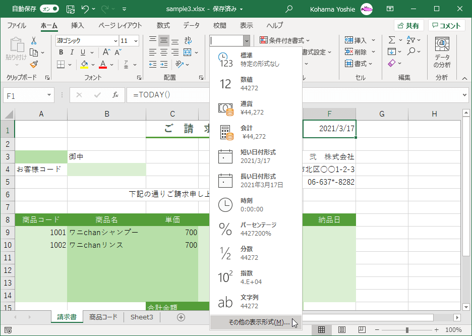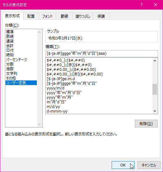 日付のユーザー定義の表示形式を設定するには