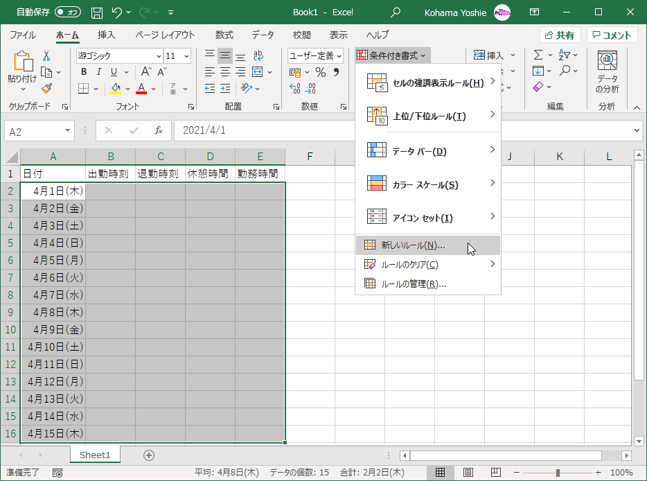 データセル範囲を選択し、[ホーム]タブの[スタイル]グループの[条件付き書式]をクリックして、[新しいルール]を選択します。