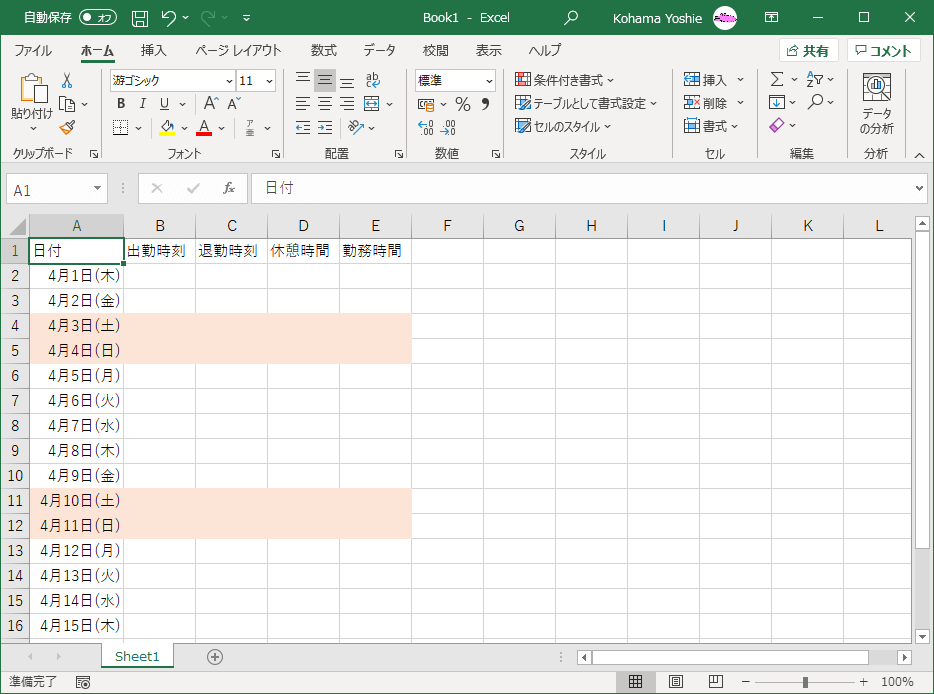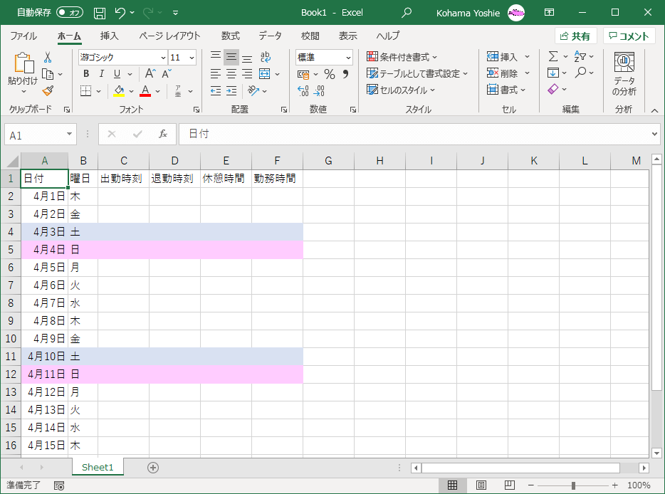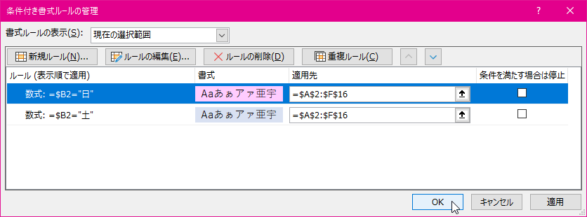WEEKDAY関数を使用して土日の行に同じ書式を適用する