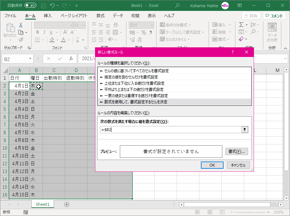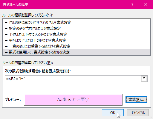 - [次の数式を満たす場合に値を書式設定]ボックスの「土」を「日」に変更します。
