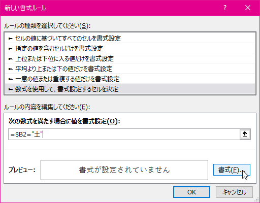 - 続けて ="土" と入力し、[書式]ボタンをクリックします。