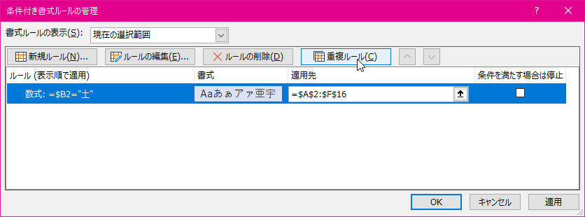 - [条件付き書式ルールの管理]ダイアログボックスの[重複ルール]ボタンをクリックします。