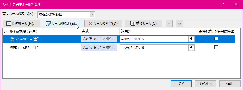 TEXT関数で日付に対する曜日が求められたセルが用意されている場合は、その曜日セルが土曜日や日曜日の場合の数式をそれぞれ作成します。土曜日の分を作成した後にそのルールをコピーして編集すると効率的です。日付データのみで曜日セルが設けられていない場合はWEEKDAY関数を使う必要がありますが、種類を「2」にすることで、返される値が6以上にすればいいので、土日まとめて同じ書式を設定する場合は効率的です。