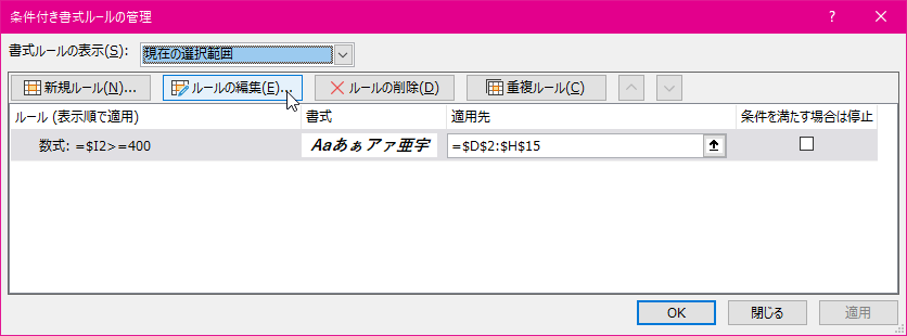 - [条件付き書式ルールの管理]ダイアログボックスから編集したいルールを選択して[ルールの編集]ボタンをクリックします。