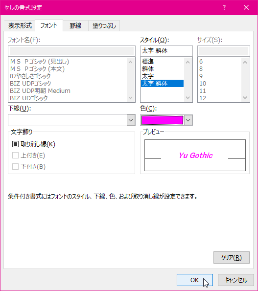 - 書式が設定できたら[OK]ボタンをクリックします。