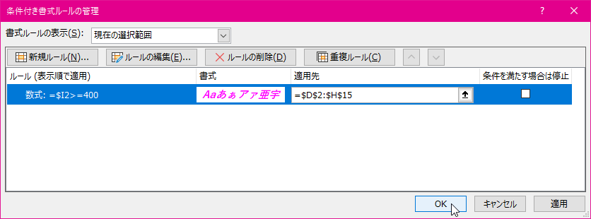 - [条件付き書式ルールの管理]ダイアログボックスからの[OK]ボタンをクリックします。