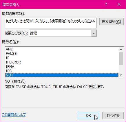 - NOT関数を選択して[OK]ボタンをクリックします。