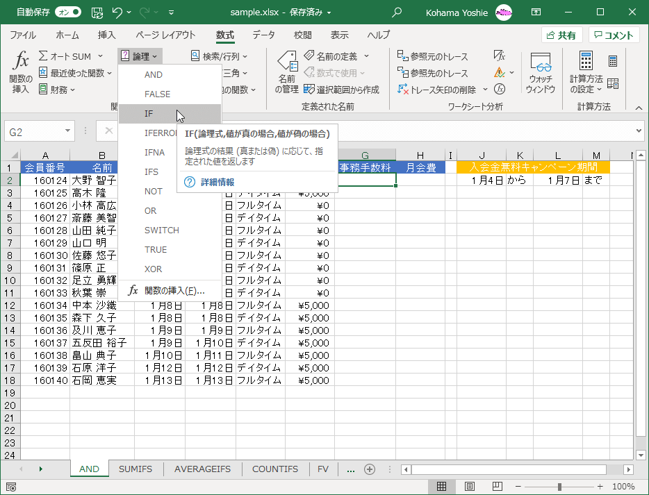 - 求めたいセルを選択して[数式]タブの[論理]関数より[IF]を選択します。