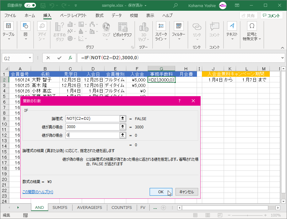 - [真の場合]には「3000」、[偽の場合]には「0」と入力して[OK]ボタンをクリックします。
