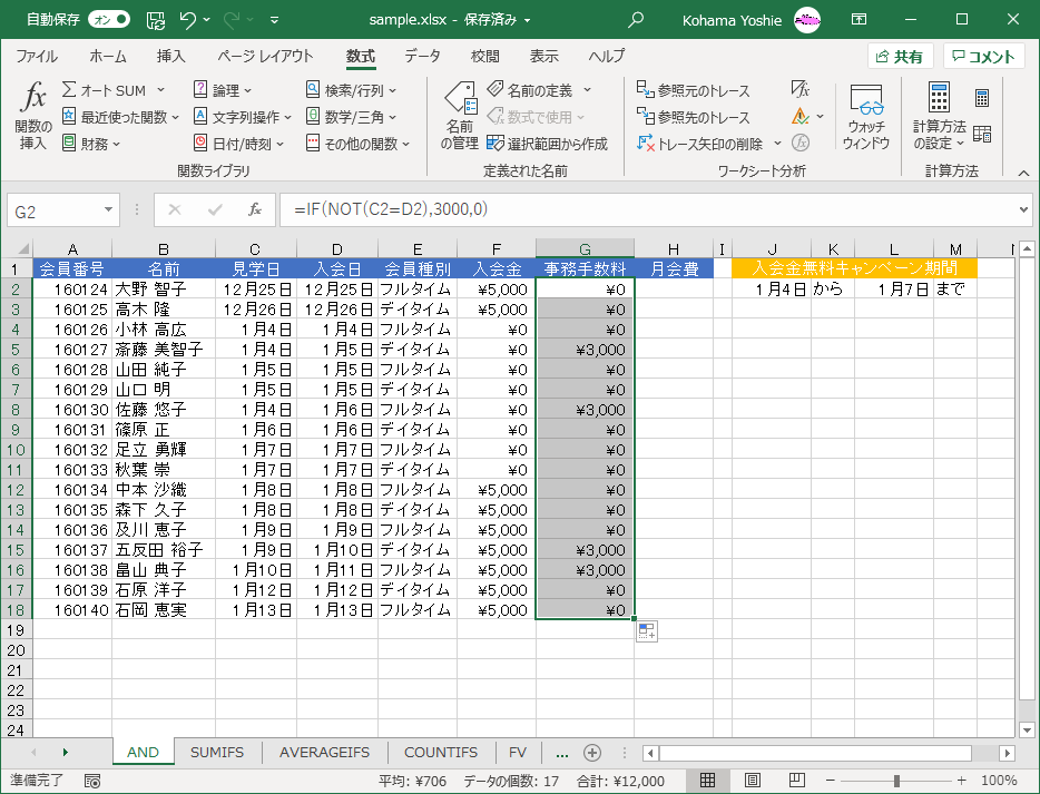 ここでは、見学日と入会日が同日でない場合に事務手数料3000、そうでなければ0を返す方法について説明します。