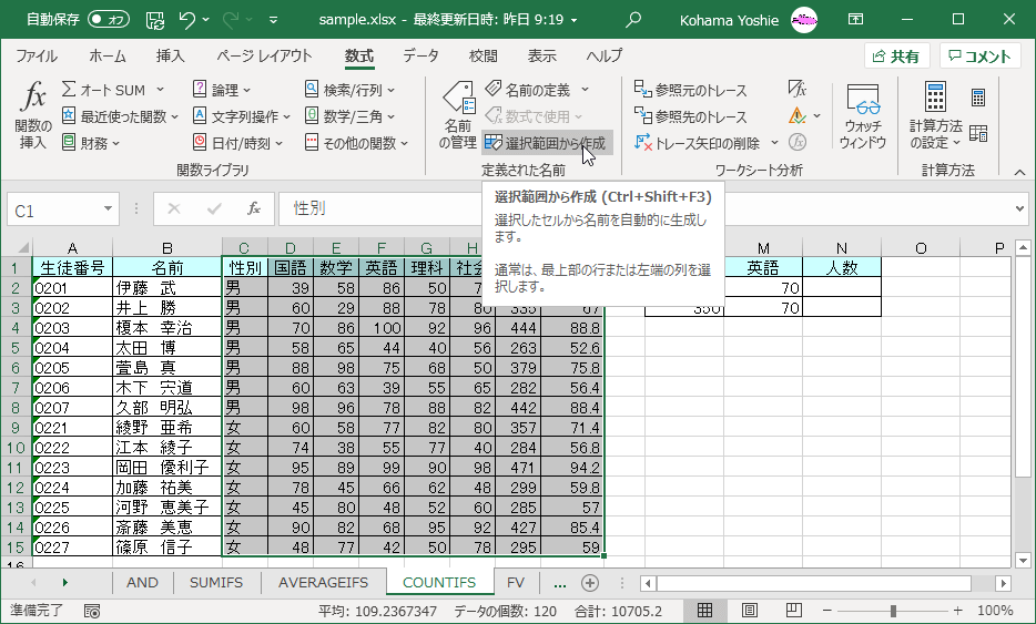ここでは、データ範囲の上端行に名前を作成して、条件設定されたセル範囲に基準を満たした生徒の人数を求める方法について説明します。