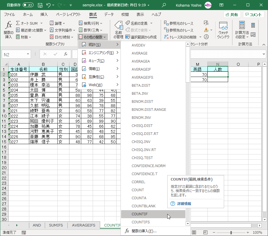 求めたいセルを選択して、[数式]タブの[その他の関数]をクリックして、[統計]をポイントし、[COUNTIFS]を選択します。