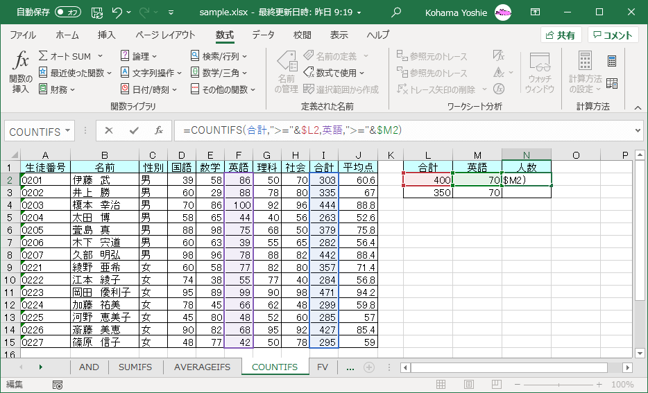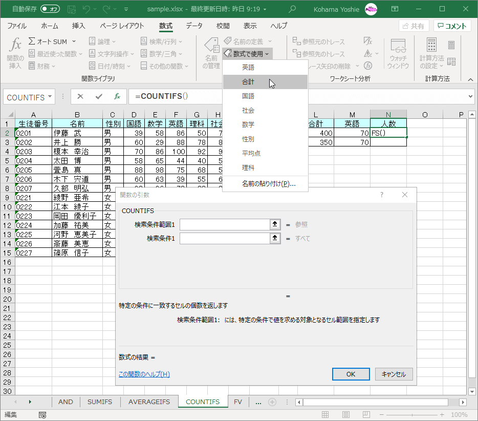 ">="&と入力し、合計の基準点の入ったセルを選択して、F4キーを3回押します。 - [検索条件範囲2]には「英語」と入力するか、[数式で使用]一覧から[英語]を選択します。