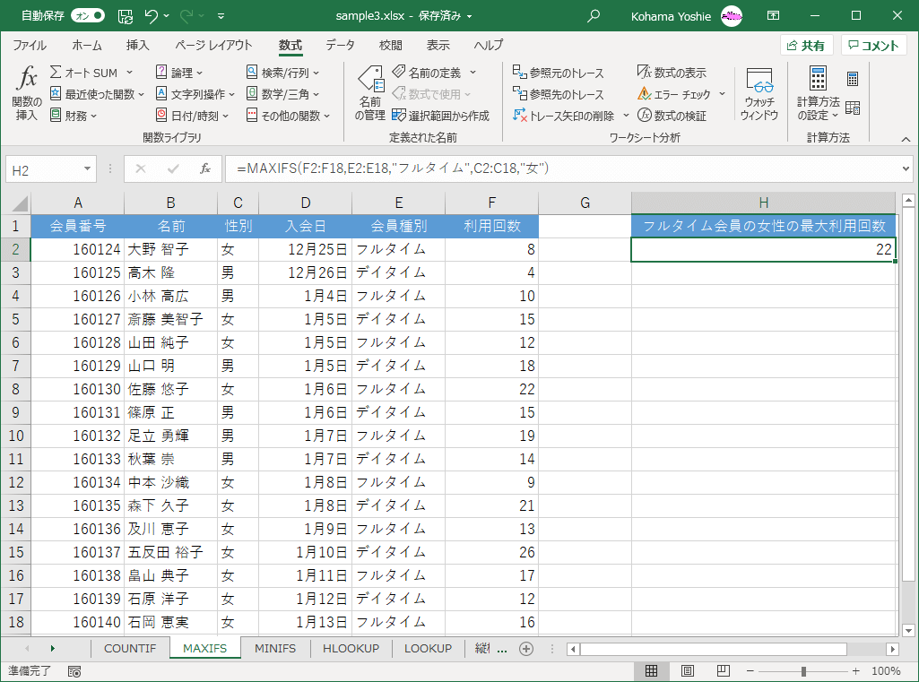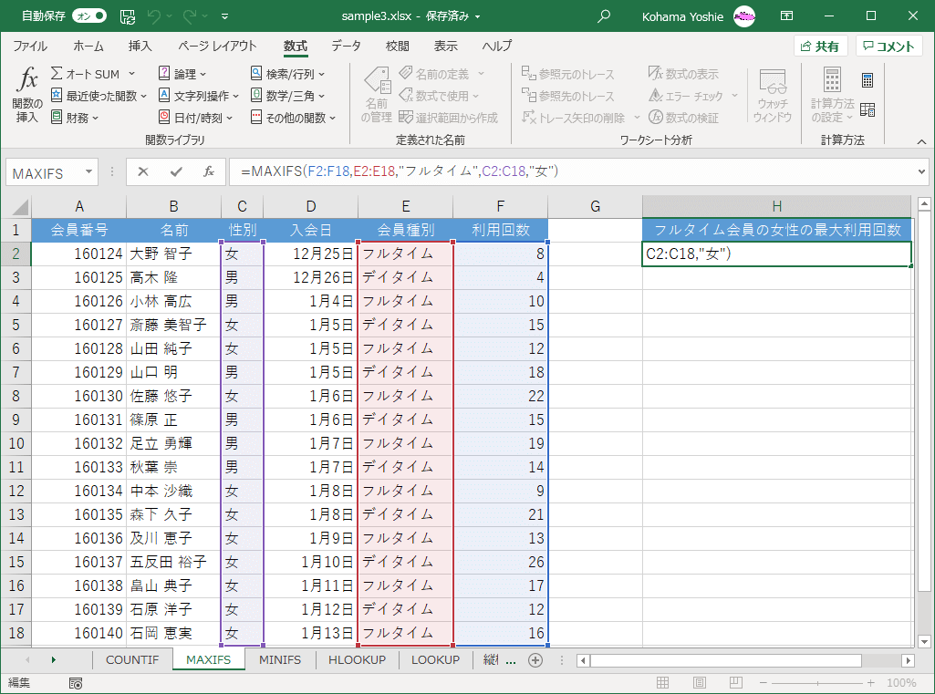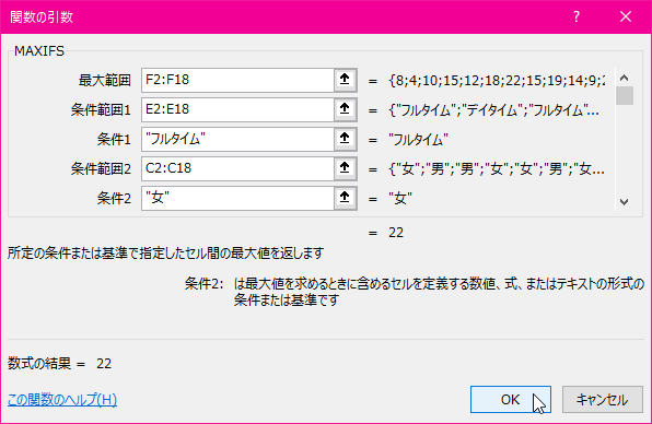 =MAXIFS(F2:F18,E2:E18,"フルタイム",C2:C18,"女")