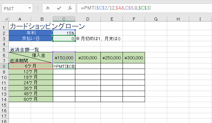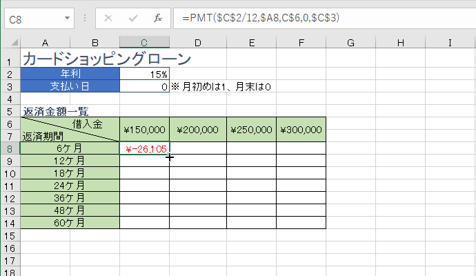 - [期間]には、返済期間のセルを選択して、右方向に数式コピーしてもずれないように列固定します。