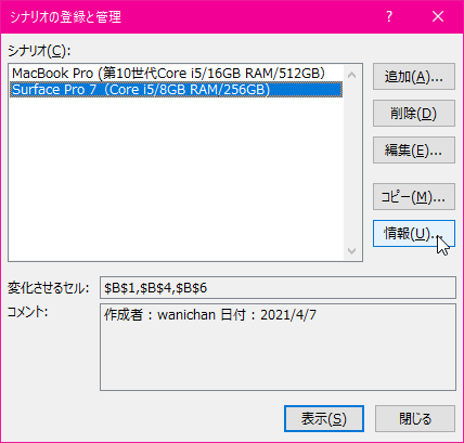 - [シナリオの登録と管理]ダイアログボックスの[情報]ボタンをクリックします。