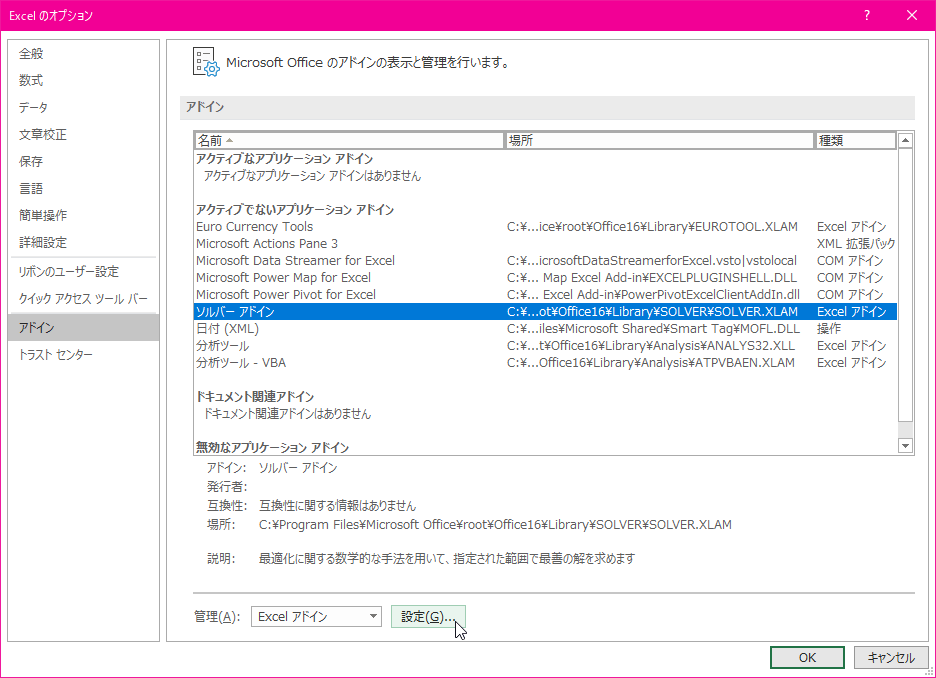 ただし、ソルバーを利用できるようにするには、あらかじめソルバーアドインを有効にする必要があります。