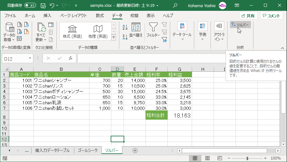 現状の売上が以下のようになっていて、ワニchanシャンプー、ワニchanリンスとワニchanボディシャンプーが在庫切れで、そのほかの3商品にはまだ在庫ある場合、粗利を20000円出したいとき、あとどれくらい販売すればいいのかを求めるには、ソルバーを利用するとよいでしょう。