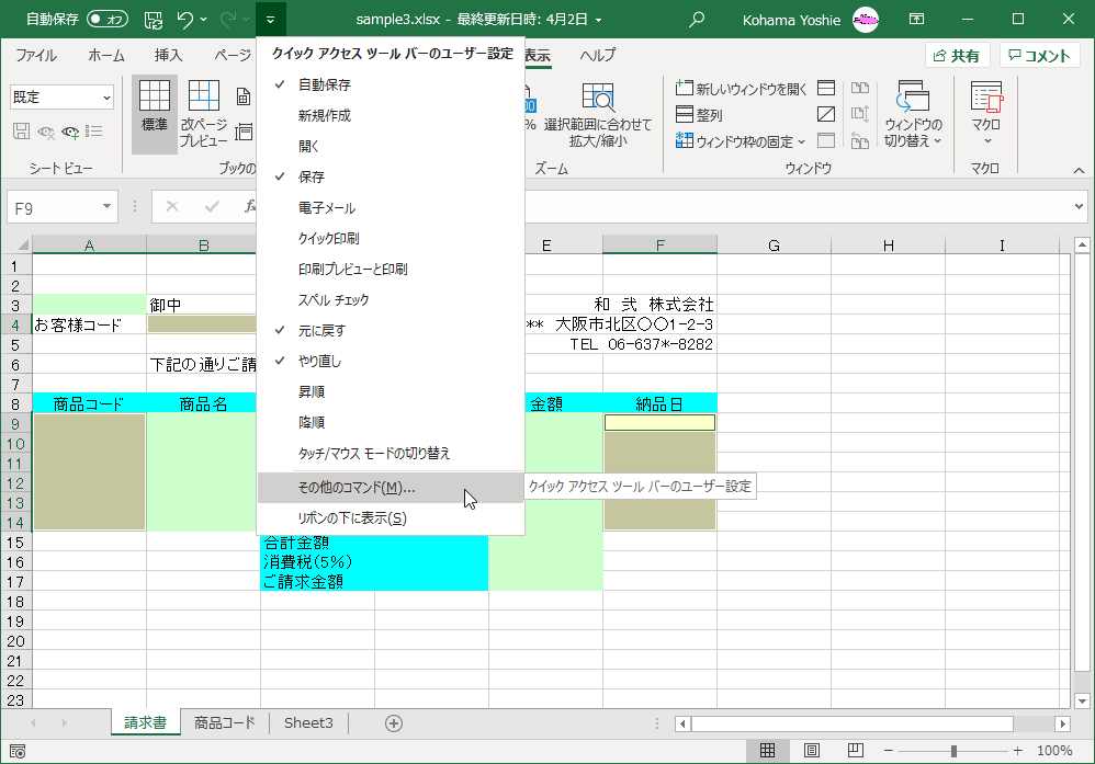 - クイックアクセスツールバーの▼をクリックして、[その他のコマンド]をクリックします。