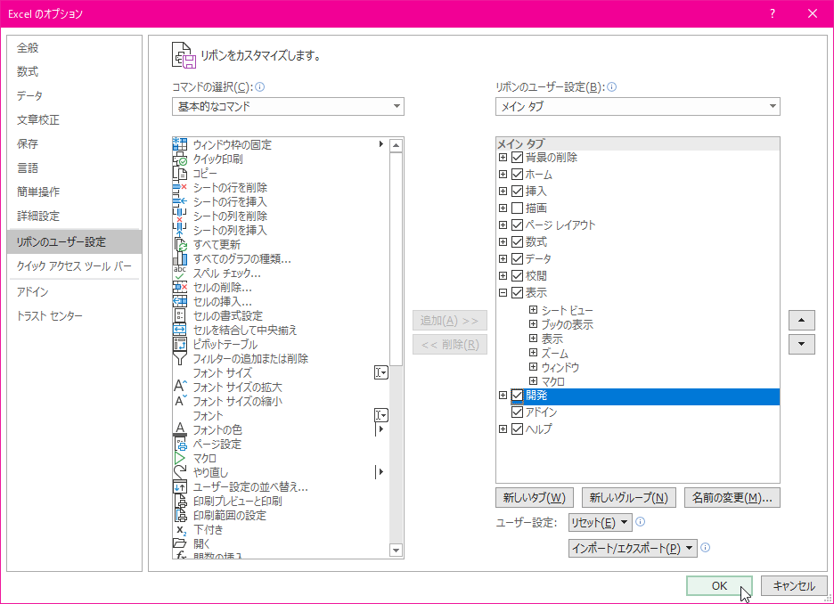 - 右側の[リボンのユーザー設定]の[メインタブ]一覧より[開発]にチェックを入れて[OK]ボタンをクリックします。