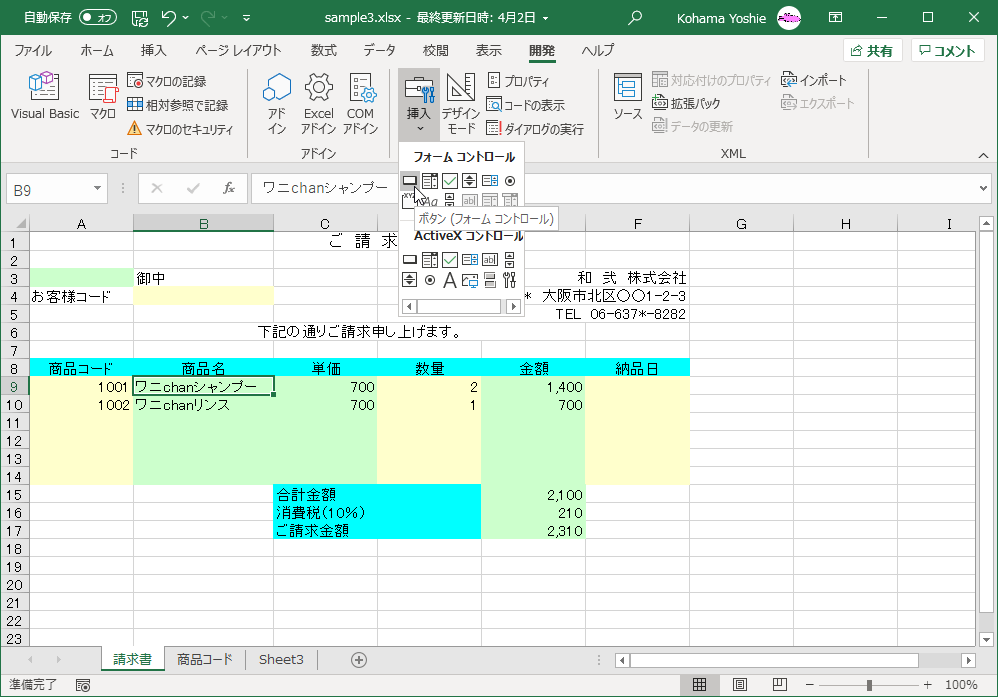 - [開発] タブの [コントロール] グループで [挿入] 一覧より[ボタン (フォーム コントロール)]をクリックします。