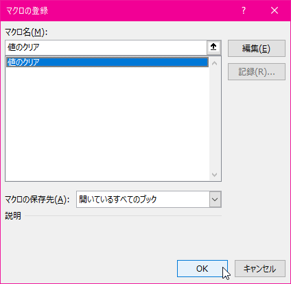 - 登録済みのマクロを選択して[OK]ボタンをクリックします。