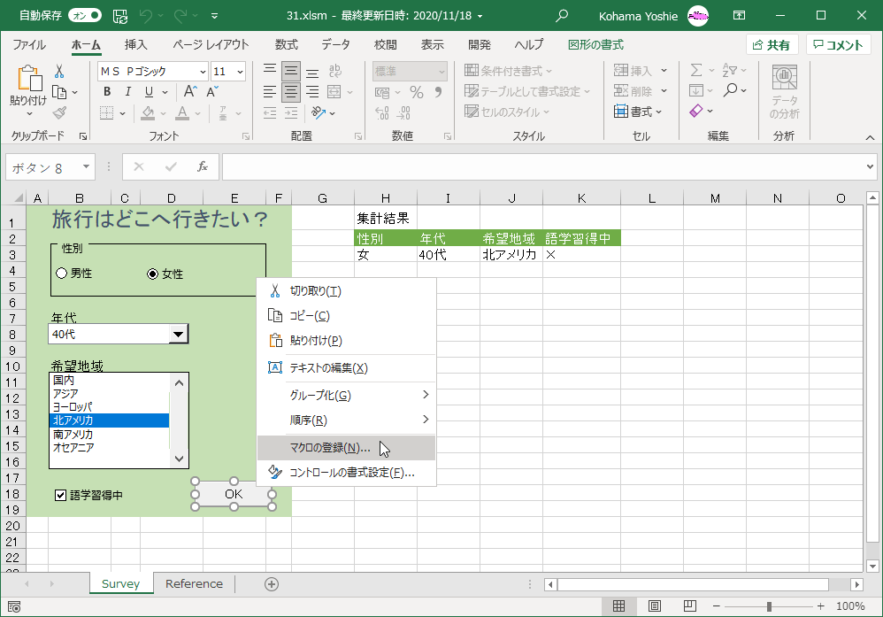 - ボタンを右クリックしてショートカットメニューより[マクロの記録]を選択します。