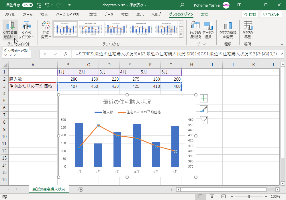 - 近似曲線を追加したい系列を選択して[グラフのデザイン]タブを開き、[グラフ要素を追加]をクリックします。
