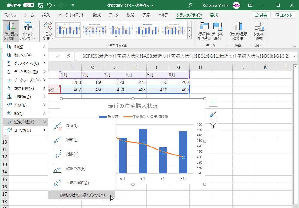 - 近似曲線を追加したい系列を選択して[グラフのデザイン]タブを開き、[グラフ要素を追加]をクリックして[近似曲線]オプションより[その他の近似曲線オプション]を選択します。
