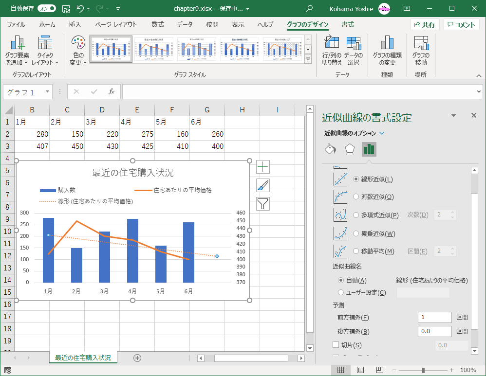 なお、線形近似曲線の予測線(前方補外/後方補外)を追加することも可能です。