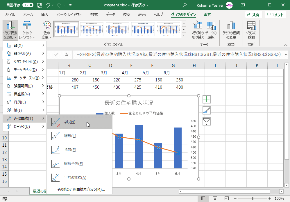 近似曲線を削除したい系列を選択して[グラフのデザイン]タブを開き、[グラフ要素を追加]をクリックして[近似曲線]オプションより[なし]を選択するとOKです。