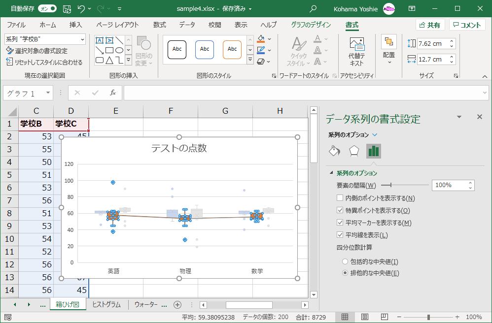 箱の色などのスタイルを変更するには、グラフ上の変更したい項目を選択し、[書式]タブで必要な変更を行います。