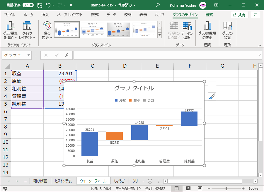 ウォーターフォールグラフ(滝グラフ)は、最初の値 (たとえば、収益) が、一連の正の値(粗利)または負の値(原価や管理費)によって、どのように増減するのかを把握するのに役立ちます。 データ範囲を選択して[挿入]タブの[ウォーターフォール図、しょうごグラフ、株価チャート、等高線グラフ、レーダーチャートの挿入]一覧より[ウォーターフォール]を選択します。あとで合計値のデータ要素を、データ要素の書式設定で合計として設定する必要があります。