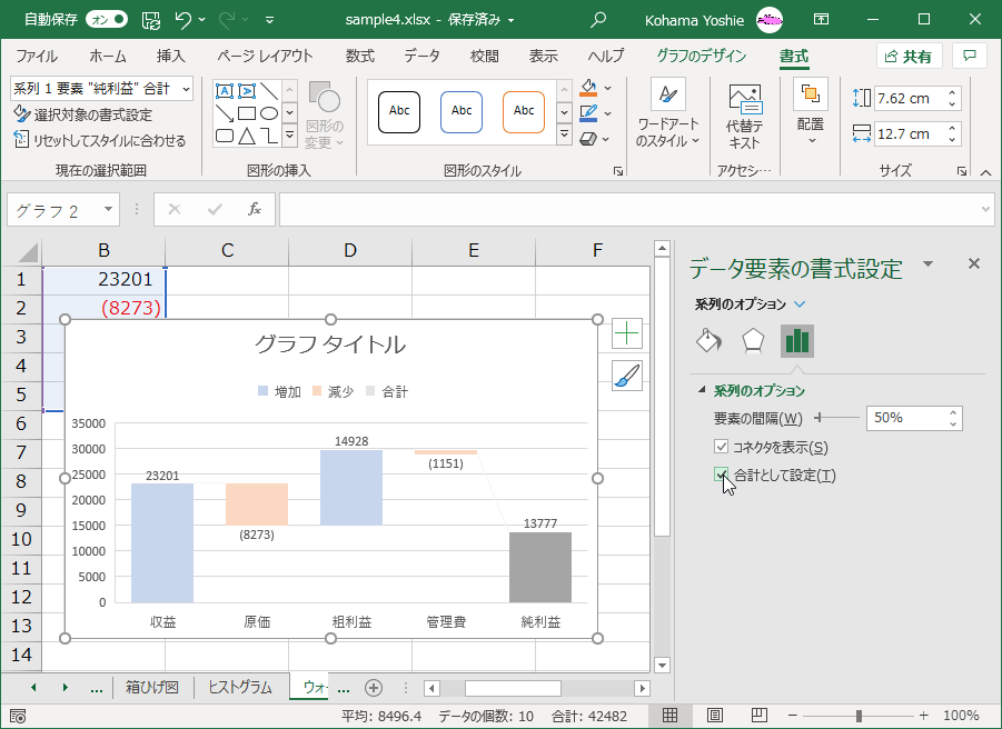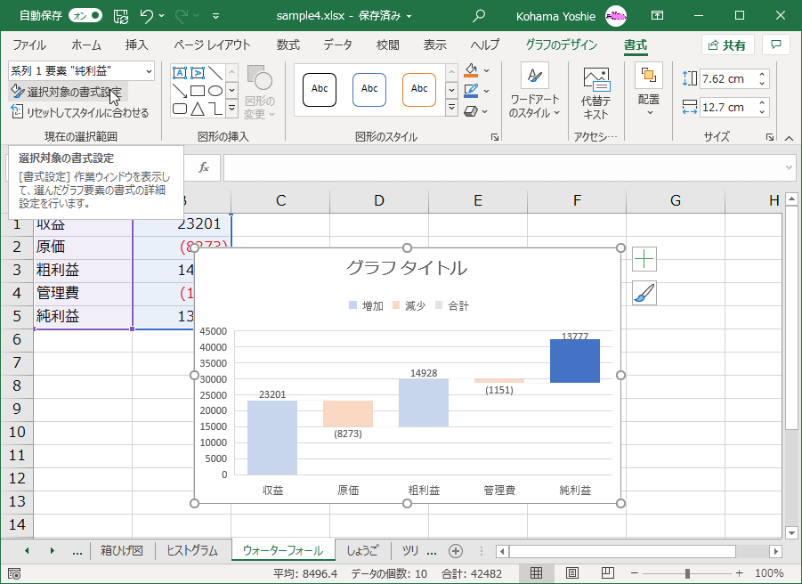 ウォーターフォールグラフ内で、合計として設定したいデータ要素を選択し、右クリックして[データ要素の書式設定]を選択するか、[書式]タブの[選択範囲の書式設定]を選択します。
