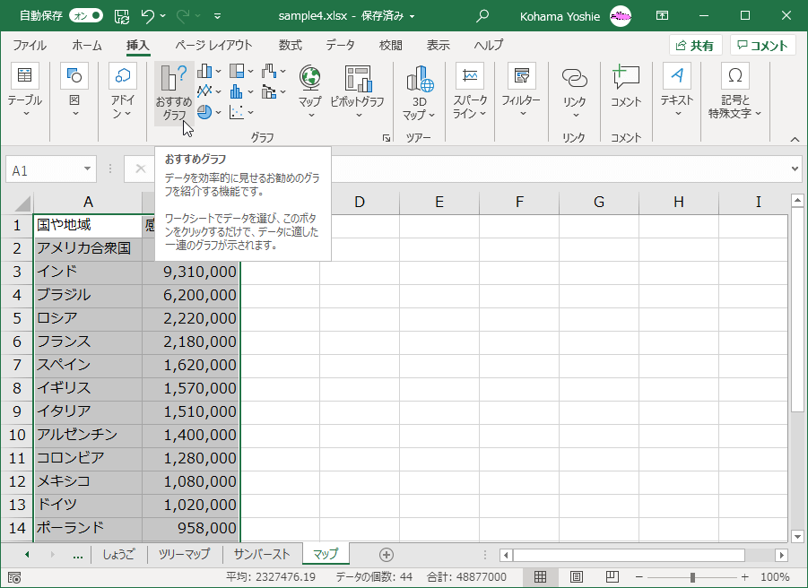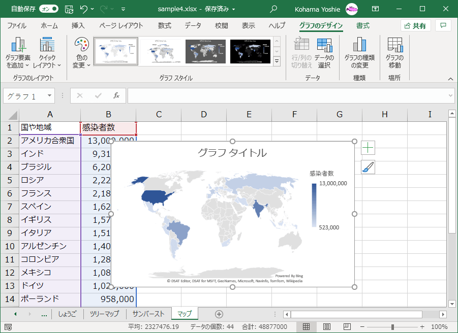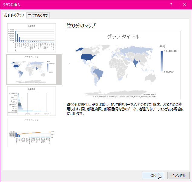 国や地域名が含まれるデータであれば、おすすめグラフからも塗り分けマップの選択が可能です。
