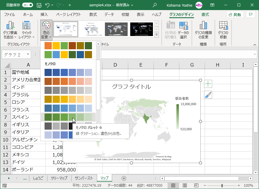 マップグラフを選択し、[グラフのデザイン]タブの[色の変更]から色を選択します。
